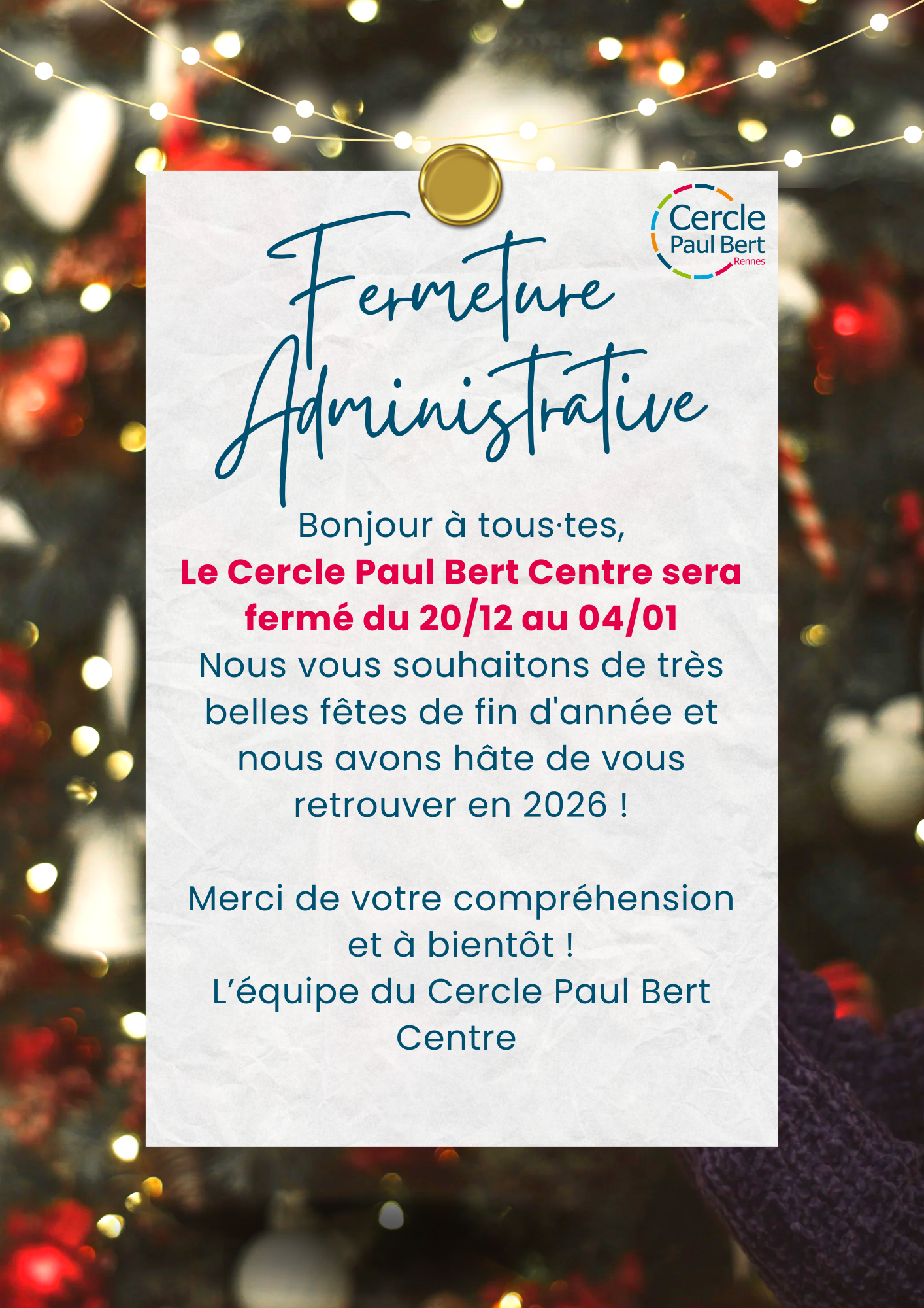 Fermeture administrative CPB Centre Déc 29 19 décembre 2025 / 17h00 - 5 janvier 2026 / 13h30 Fermeture administrative CPB Centre