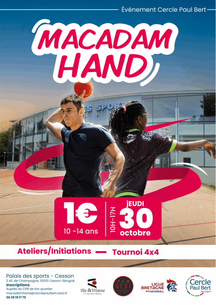 Le Macadam’Hand est un tournoi de handball à 4 qui a pour but de faire découvrir le handball aux jeunes des quartiers rennais. Des rencontres amicales inter-quartiers, dans lesquelles on implique des joueurs de haut niveau, permettent aux jeunes d’apprendre à connaitre le handball.