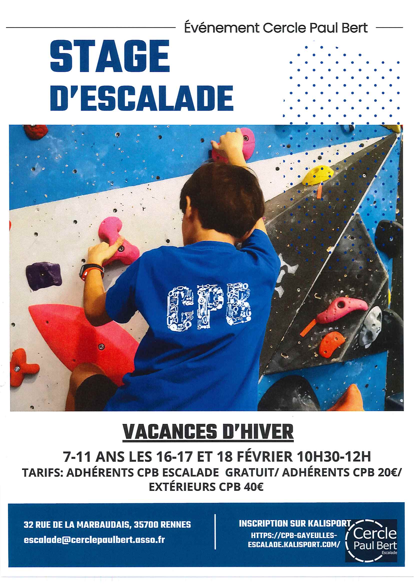 Stage escalade 7-11 ans au CPB Rennes escalade. Accessible aux débutants ou non. Du lundi 16 au mercredi 18 février de 10h30 à 12h.Réservations en ligne.TARIFS :GRATUIT - Adhérents CPB escalade20€ - Adhérents CPB40€ - Extérieurs CPB